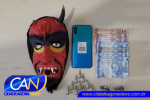 Durante patrulhamento, os policiais perceberam atitude suspeita de um indivíduo, que tentou descartar uma sacola ao notar a aproximação da viatura. Na abordagem, foram encontrados pinos de substância análoga à cocaína, porções de maconha, um celular, uma máscara e dinheiro em espécie.